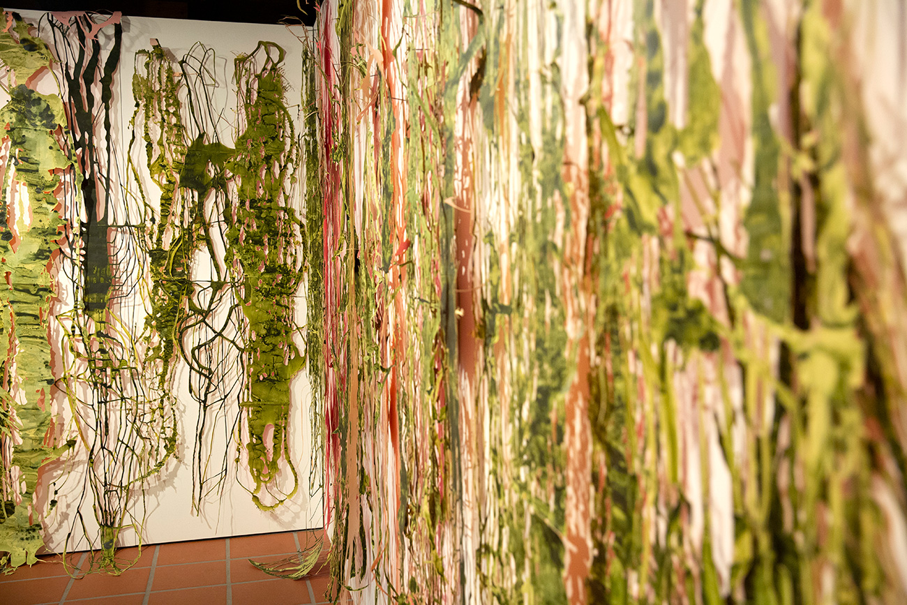 Christine Bänningers Werke gehen oft aus Langzeit-Projekten in Malerei und Performance hervor. Dabei lässt sie ihrem Drang, «mit Haut und Haar zu malen», immer wieder freien Lauf. Malerei und Körper, Körper und Malerei sind ohne einander nicht denkbar. Grosszügig und unkontrolliert übers Blatt gegossene Farbe ist der Grund, auf dem die Künstlerin ihr eigenes Gewicht rollen lässt. Das Prinzip Zufall lässt Spuren auf dem Papier auswachsen. Die blind angelegten Silhouetten werden zur Kontur des Scherenschnitts. «liquid olive» (seit 2020) mutet an wie das All-Over einer immergrünen Kletterpflanze. Welche Rhythmen wiederholen sich? Wie nahe kommen sich Natur-Idee und Textil-Entwurf? Wachsen und Vertrocknen, Werden und Zerfall durchdringen sich – Christine Bänningers künstlerische Erfahrung spricht fast beiläufig auch von der Abhängigkeit des Menschen von der Natur.