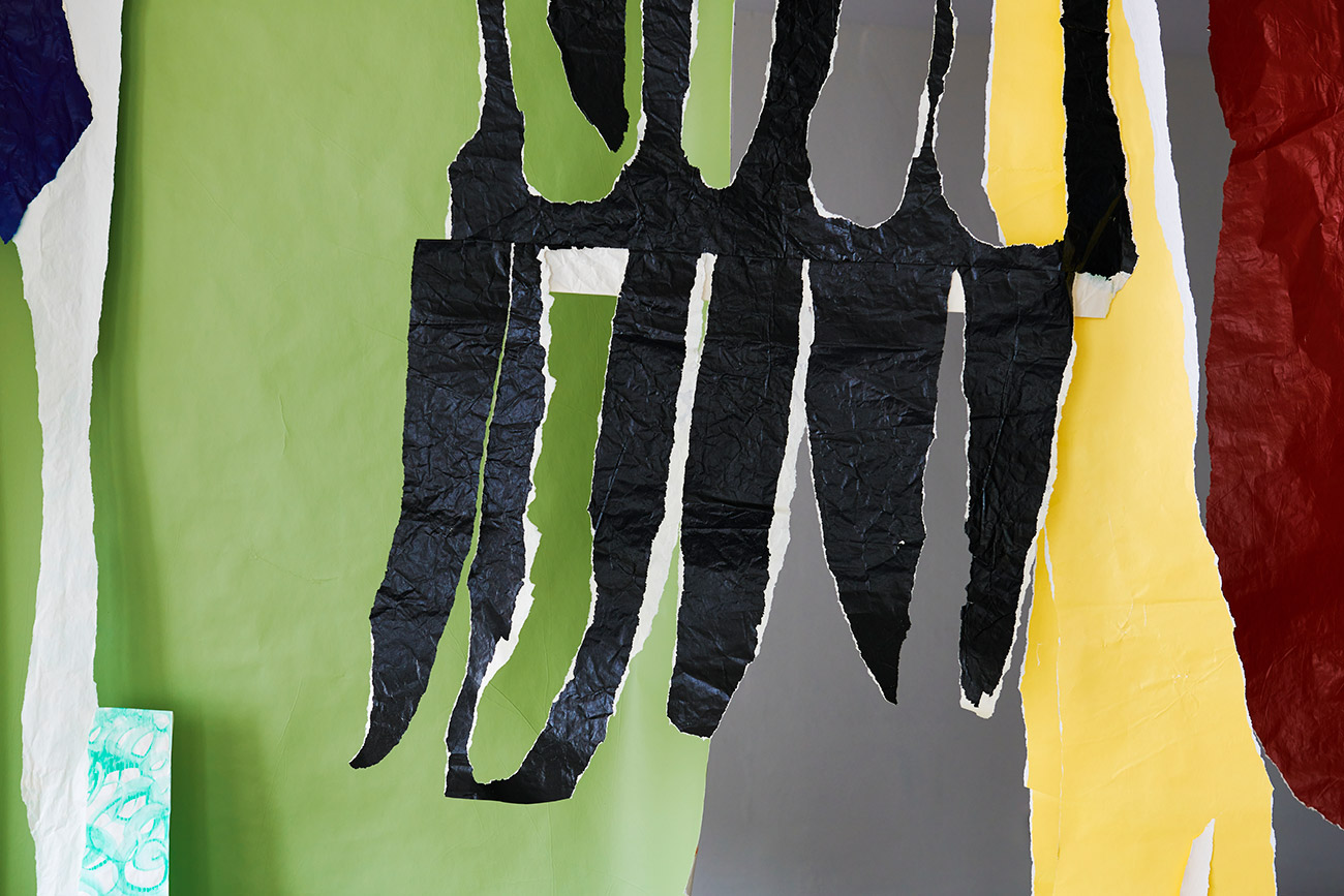 Auch Katrin Hotz (*1976, lebt und arbeitet in Biel) sucht den direkten Bezug zur gebauten Umgebung. Malerei ist mehr als Farbe auf planem Grund. Zeichnung will am Raum Mass nehmen, Papier im ersten Stockwerk des Zimmermannhaus den Bezug zu Mauern, Türen, Durchfensterung. Eingefärbte Papierbahnen, an die Wand appliziert, imitieren in Hotz’ Werkserie «enough» (seit 2013) wiederholt den Gestus expressiver Malerei, bilden temporäre Kompositionen aus, sprengen gewohnte Grössenverhältnisse. Ausserhalb gegebener Rahmungen fragen ihre Interventionen nach den Grenzen und der Beweglichkeit des Mediums «Bild». Im Bemalen, Falten, Zerknittern von Papierbahnen nimmt die Ausdehnung von Malerei skulpturale Qualität an, Architektur wird zum Träger grosser «Papiers découpés». Nun testet die Künstlerin ihr Ausgangsmaterial erneut: Papierbahnen von unterschiedlicher Haptik und Grösse führt sie zu bunten Geflechten zusammen. Angerissene Konturen geben monochrom bestrichenen Bändern weisse Ränder mit, geschnittene Kanten lassen die Temperatur benachbarter Farben unvermittelt aufeinandertreffen. Der Zufall darf mitspielen in dieser raumgreifenden Praxis. Wobei der spontane Zugriff das Papier von seiner ebenso strapazierfähigen wie verletzlichen Seite zeigen kann.