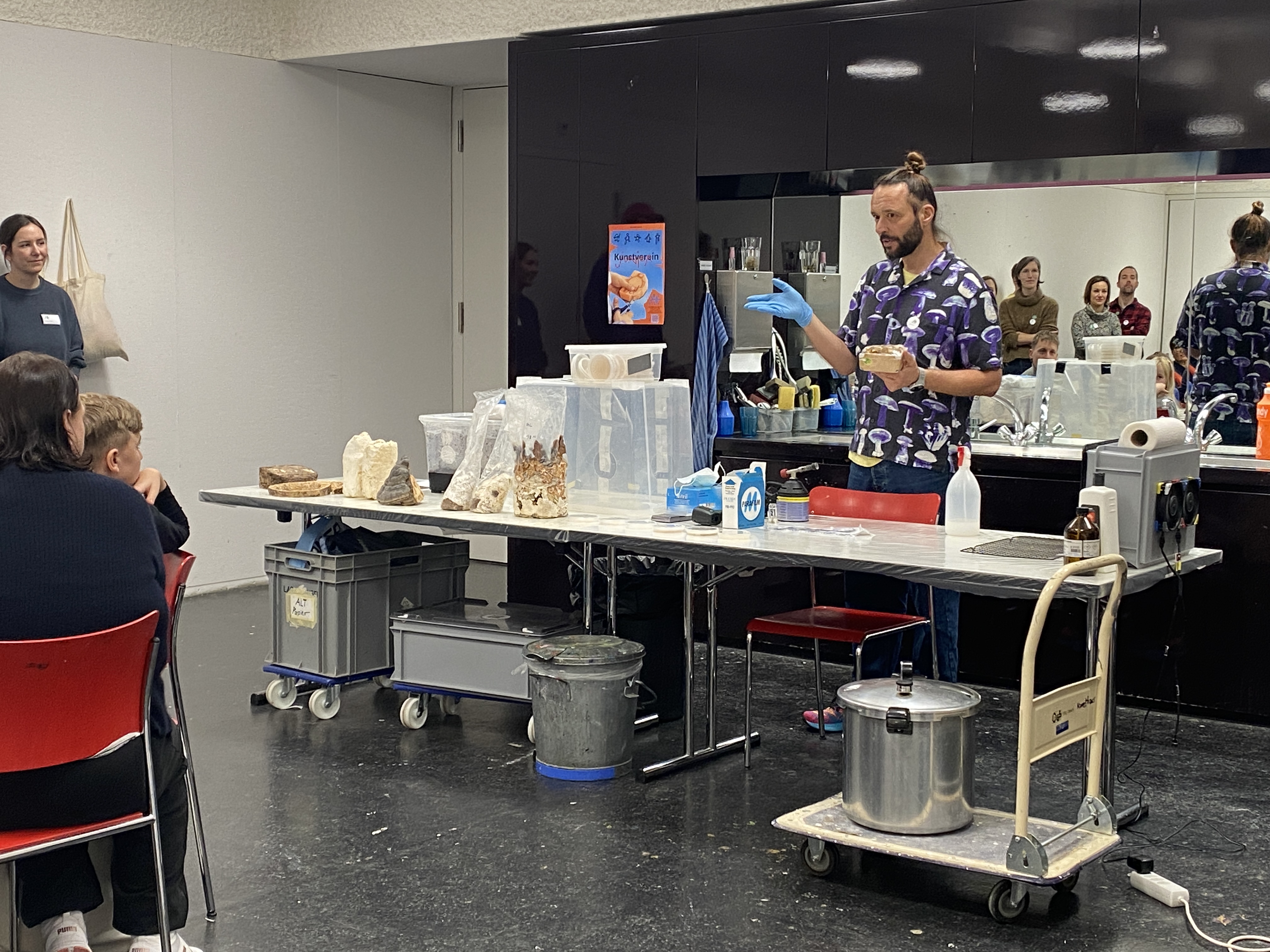 EIN PILZZUCHT-WORKSHOP MITJONAS STUDER. KÜNSTLER, BRUGGPilze wachsen nicht nur im Herbstwald. Sie bewohnen und durchwirken unsere Welt, weit mehr, als wir dies bewusst erkennen können. So bereichern sie nicht nur unsere Nahrungsmittel mit gesunden und wohlschmeckenden Fruchtkörpern, sind verantwortlich für viele wichtige Gärungsprozesse und liefern wichtige Inhaltsstoffe für unsere Medizin, sie sind auch in der ökologischen Agronomie essentielle Mitarbeiter (als Mykorrhiza Netzwerk), beliefern uns mit schnellwachsenden Baustoffen und helfen mit ihren Enzymen die Erde von Schadstoffen zu befreien. Höchste Zeit also, zu lernen, wie man DIY zu Hause seine eigenen Pilze züchten kann.«May the spores be with you» ist ein performatives Workshop-Format, das die Aufzucht und das Zusichnehmen von Fungi thematisiert.